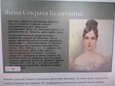 На сайте "Биограф" выставлено изображение жены Сократа (если картинка не открывается зайдите по ссылке) в таком образе: дама пушкинской эпохи с бриллиантами в перьях, в общем перед балом, может даже это Наталья Гончарова, есть сходство.