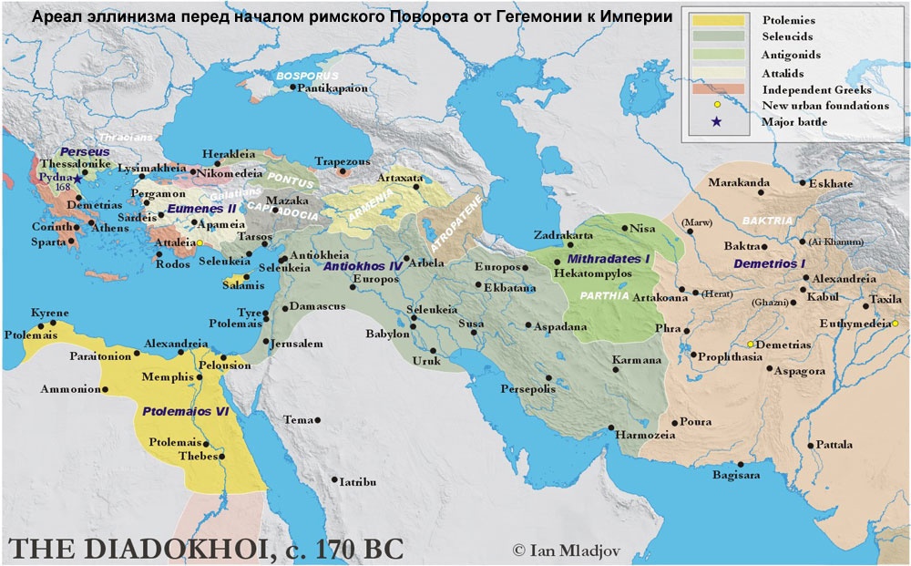 После завоеваний Александра прошло уже полтора столетия, но европейская цивилизация прочно удерживала контроль над сердцем Азии, включая Среднюю Азию и северо-западную Индию, и постепенно окультуривала этот регион. Римская политика по дестабилизации Державы Селевкидов привела к тому, что она сократилась до размеров нынешней Сирии, а основная ее часть была захвачена парфянами. Греко-бактрийское царство (показано розовым), отрезанное парфянами от ареала эллинизма, вскоре тоже стало жертвой кочевых орд.