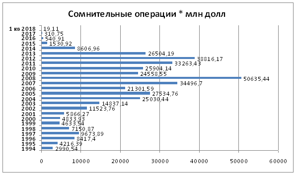 ** Сомнительные операции включают имеющие признаки фиктивности операции, связанные с торговлей товарами и услугами, с покупкой/продажей ценных бумаг, предоставлением кредитов и переводами средств на собственные счета за рубежом, целью которых является трансграничное перемещение денежных средств. Если не полениться и вытащить эту строчку из всех балансов по годам, получим следующую картину маслом.
