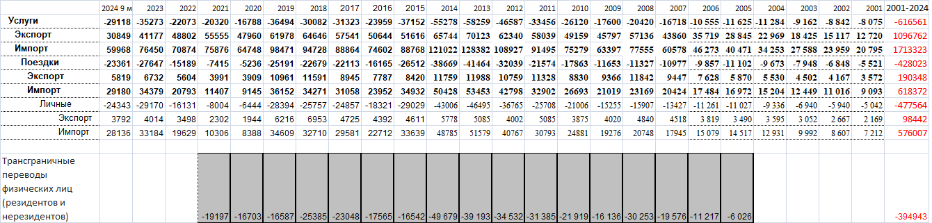 Данные с 2001 года. Как видно из таблицы за неполные 24 года на личные поездки в европы, Турцию, Египет, сказочно е Бали и т д граждане РФ потратили 576 млрд вечнозеленых, то есть с 1994 года порядка 20% профицита. Красиво жили россияне – и мир посмотрели и себя показали.