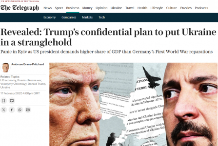 17 февраля The Telegraph: Требование Дональда Трампа о “возврате” с Украины 500 миллиардов долларов выходит далеко за рамки контроля США над важнейшими полезными ископаемыми страны. Это касается всего - от портов и инфраструктуры до нефти и газа, а также более обширной ресурсной базы страны. Условия контракта, который неделю назад попал в офис Владимира Зеленского, предусматривают экономическую колонизацию Украины со стороны США на законных основаниях. Это подразумевает бремя возмещения ущерба, которое, возможно, не может быть достигнуто. Документ вызвал ужас и панику в Киеве.