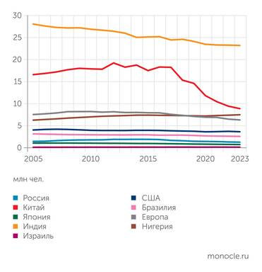 Возможно, единственное, что сегодня объединяет мир, — неумолимый демографический спад. Средний коэффициент рождаемости населения (СКР) снижается во всех без исключения странах. По итогам 2024 года в зоне «ниже воспроизводства населения» оказалось 110 стран из 195, в том числе Россия, а также большая часть пока еще густонаселенных, но стремительно стареющих государств Азии, Америки и Европы. В плюсе в основном страны Африки и бывшие советские азиатские республики. Но даже на Черном континенте, где до сих пор сохраняются высокие темпы прироста населения, суммарный коэффициент рождаемости падает со скоростью 1,3–1,6% в год, и при сохранении такой тенденции к середине столетия докатится до уровня простого замещения — 2,17. А ведь буквально пару лет назад считалось, что это произойдет только к 2100 году.