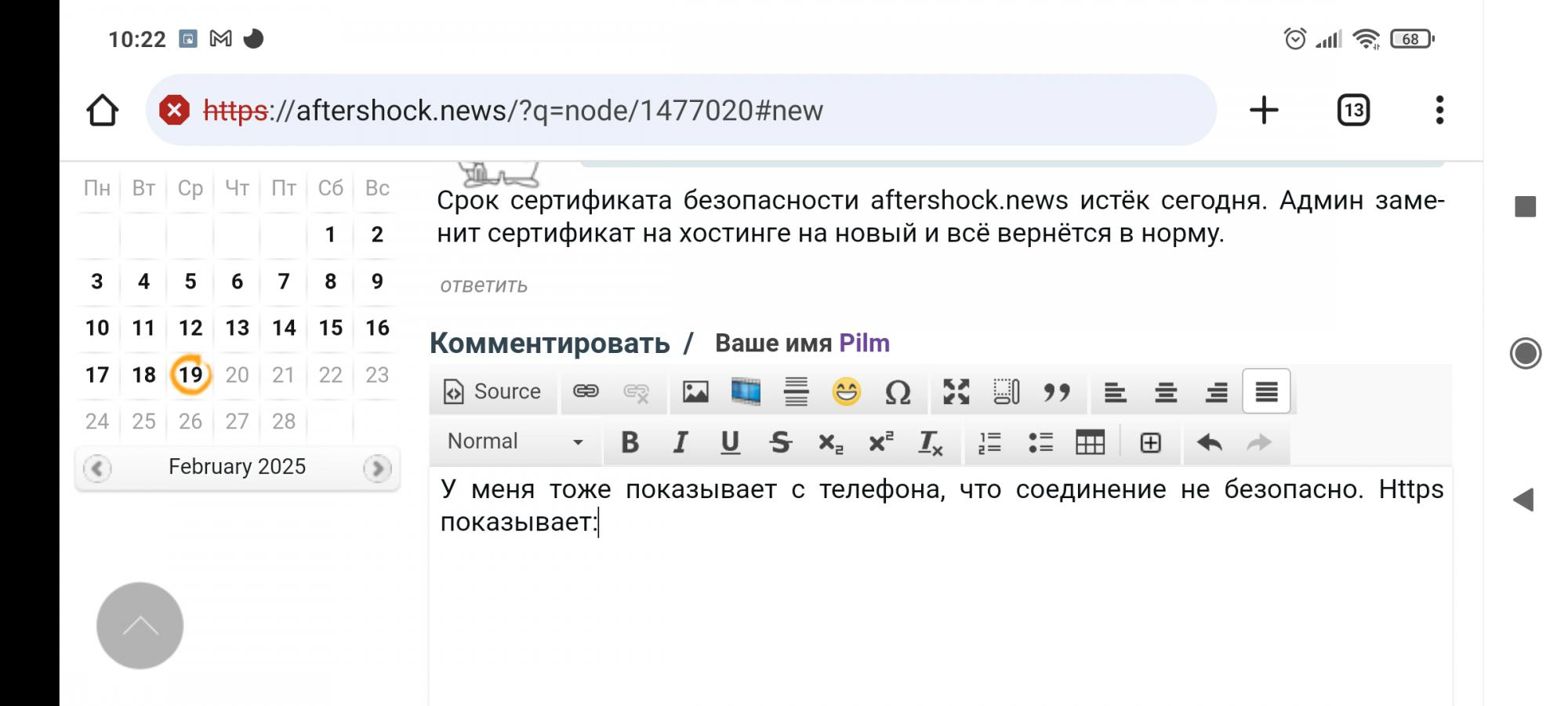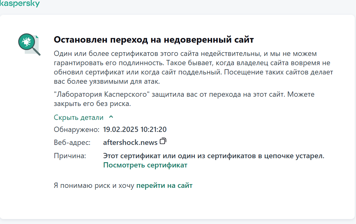 Срок сертификата безопасности aftershock.news истёк сегодня. Админ заменит сертификат на хостинге на новый и всё вернётся в норму.
