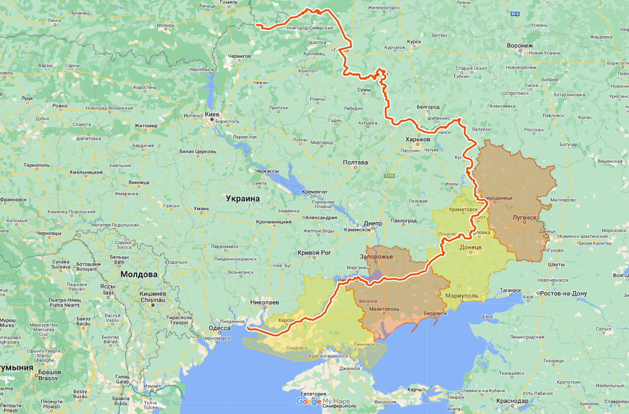 А вот так линия фронта очерчивает территорию новых областей РФ: