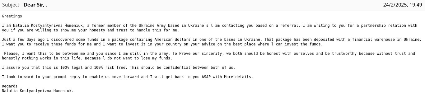Автору фишинг-идеи надо как-то намекнуть, что фундаментальная ошибка присылать такое русскому - ни один русский не поверит что что-то с фамилией Гуменюк могло найти упаковку долларов США и побежало не срочно пропивать-проедать, а писать письмо в интернет.