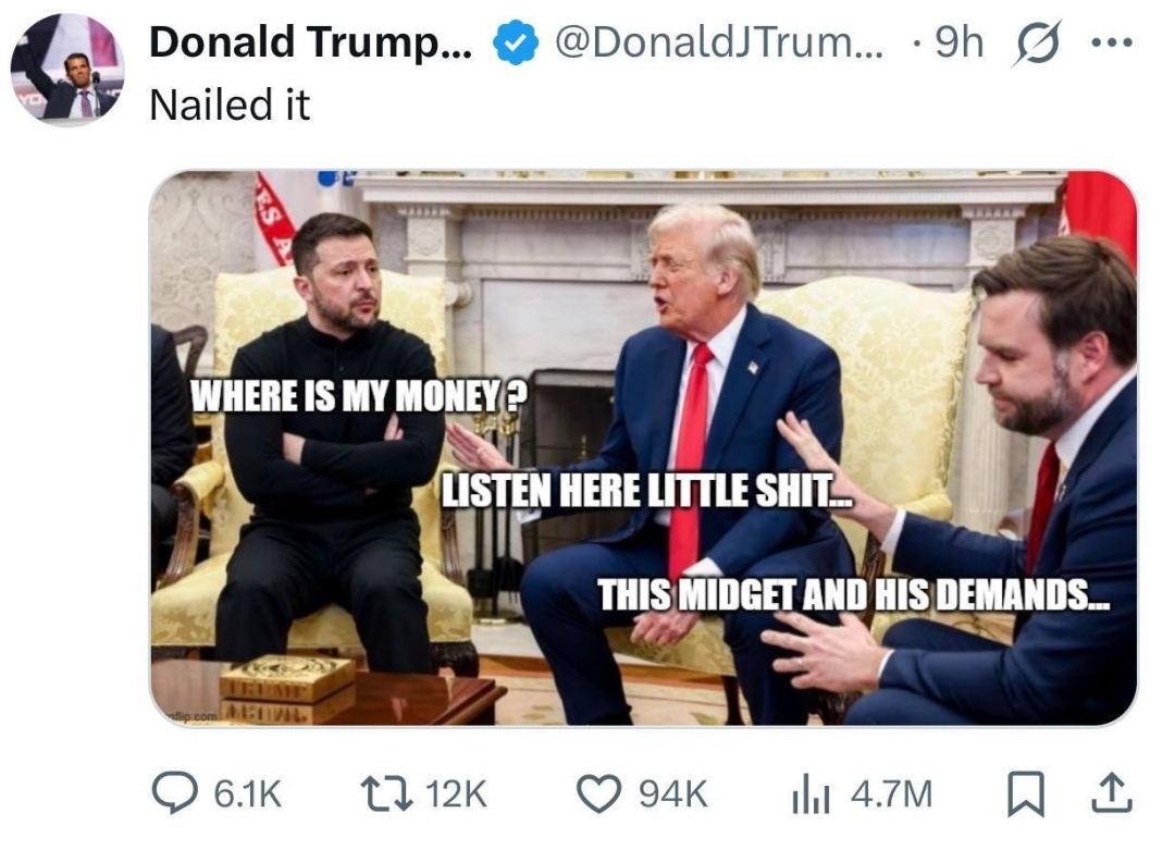 Трамп четко обозначил, кстати, условия возвращения нашкодившей просрочки. Стармер то не совсем идиот, чтобы не понимать, что ждет Зеленского в США. Побитый Зеленский, уныло соглашающийся с Трампом, поющим осанну своему другу Путину. А после этого - сразу на Украину. А чтобы Зеленскому лучше думалось, "золотой голос Трампа" немедленно выступил с интересным и крайне своевременным предложением: