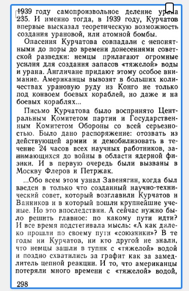 Листаю том1.ч.1. 1938 год. Скажем так-"оживление в зале". Т.е. спонтанное деление ядра вроде открыто, но материала для правительства мало, но наши физики Алиханов, Курчатов уже понимают -надо работать. Но на странице 72 ученые мужи Вавилов и Франк требуют от отделения геологии АН СССР 100 кг урана, не очень понимая, что речь идет скорее об уране 238. Не знаю в курсе был Курчатов, что даже еще 238 надо переработать горы пустой породы или солей. Т.е. даже в 1939 знали мало!"