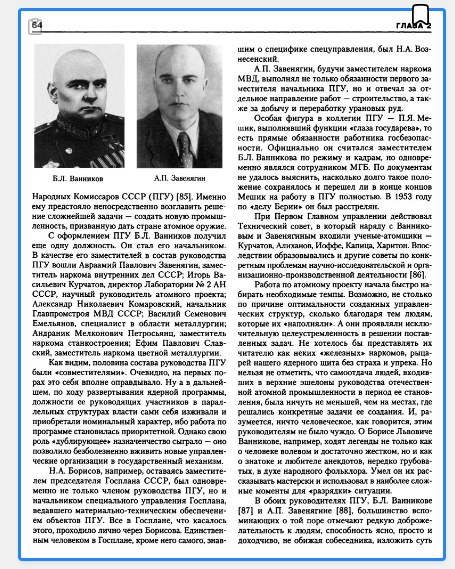 "А кто же главный или Главнейшие. Я бы отметил не Берию, а Первухина. Инженер, организатор, кадровик и вообще большой умница. Он выдвинул Курчатова, хотя Сталин хотел мудрейших академиков -Капицу.