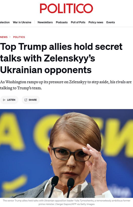 6 марта Politico: Четверо высокопоставленных членов окружения Дональда Трампа провели секретные переговоры с некоторыми из главных политических оппонентов Владимира Зеленского в Киеве, в то время как Вашингтон объединяется с Москвой в попытках отстранить украинского президента от должности.