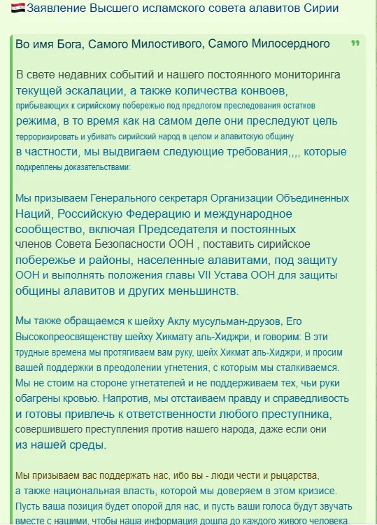 RT сообщает, что алавиты умоляют Россию, ООН и международное сообщество защитить их от нападений со стороны сил режима и их союзников, которых они обвиняют во вторжении в прибрежный регион «под предлогом преследования остатков режима [Асада], а на самом деле с целью терроризировать и убивать сирийский народ в целом и алавитскую общину в частности».