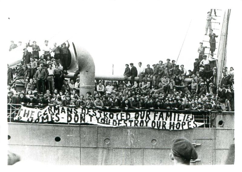 Давайте сделаем в истории шаг назад. Это растяжка на пароходе "Теодор Герцль", который прибыл в Палестину в 1947 году. Пароход загружен нелегальными еврейскими иммигрантами .