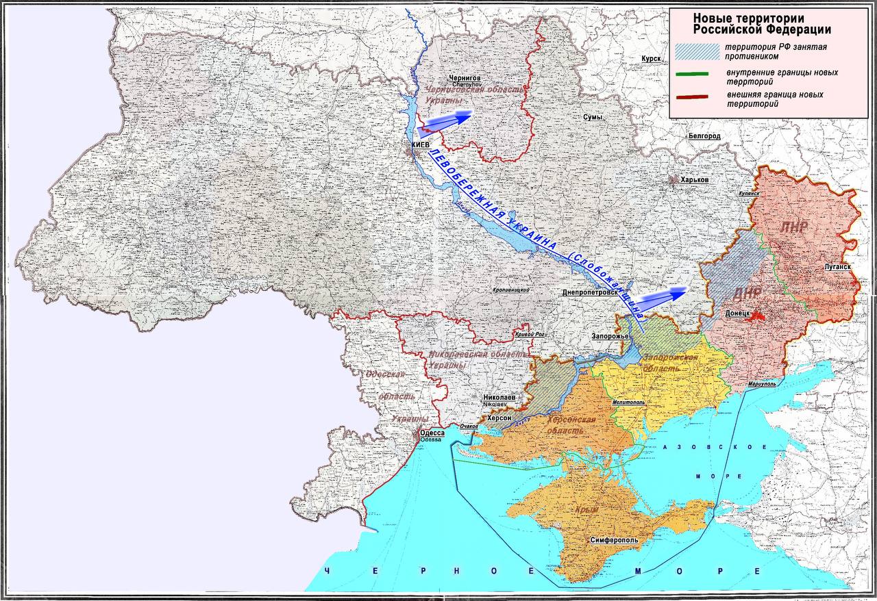 Кроме того, что все наши конституционные территории однозначно не подлежат никаким пересмотрам (и здесь мы будем требовать проведения Трибунала по фактам военных преступлений ВСУ), наши интересы распространяются также на всю левобережную Украину, на которой не должно быть войск Украины, а сами территории должны находиться под нашим протекторатом.