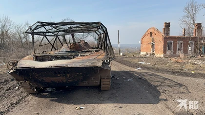 На дорогах — сожжённая украинская техника — БМП, MaxxPro, пикапы… На одном — ирландские номера. Далеко заехал. Снова выходим к колонии.