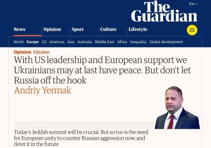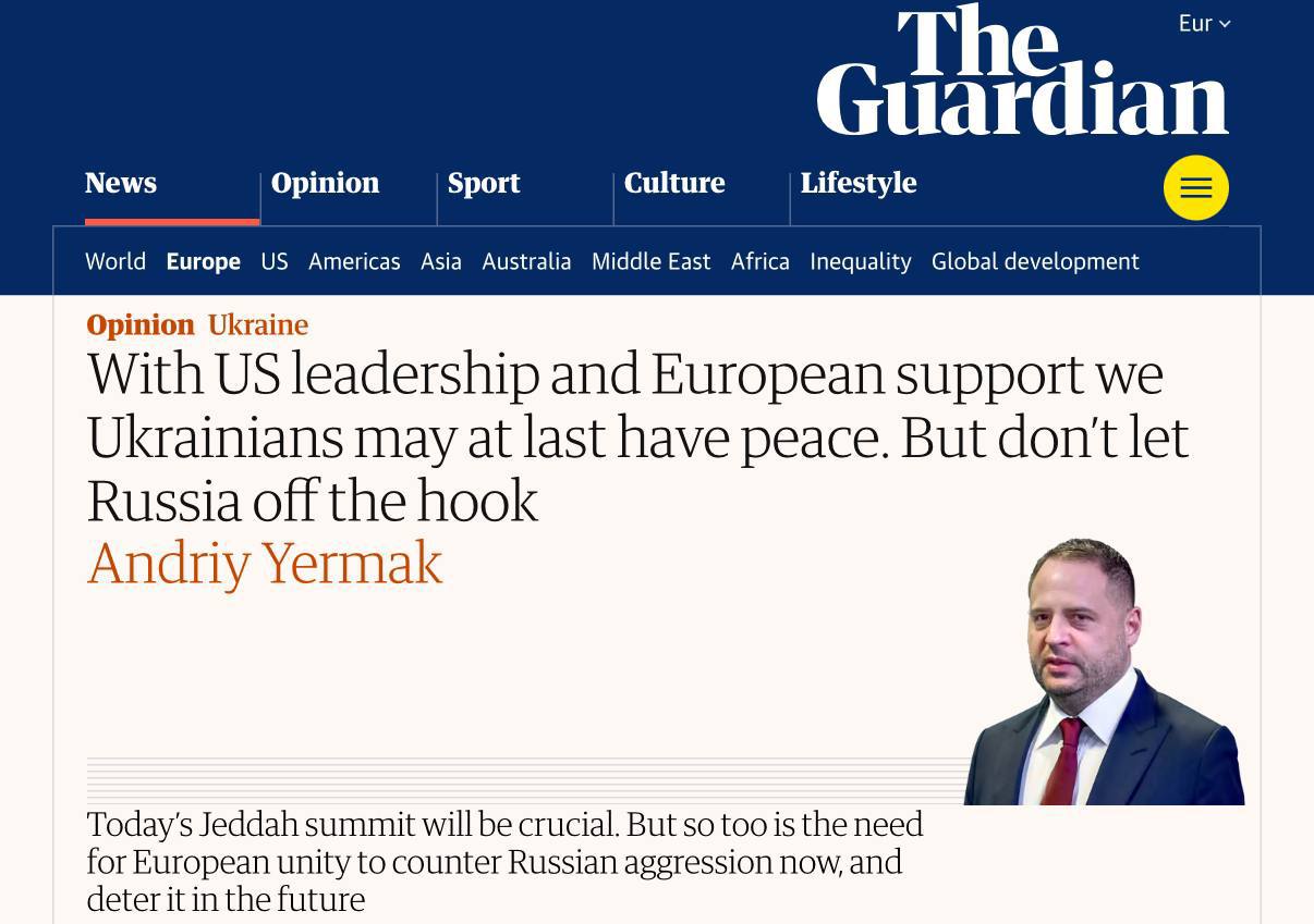 Статья главы администрации укро-президента Андрея Ермака в The Guardian: По мере того, как я прибываю в Джидду, Саудовская Аравия, прекращение огня в трёхлетнем конфликте, кажется всё более вероятным. Недавние переговоры между Украиной и её партнёрами вселяют большую надежду на то, что украинский народ очень скоро вернётся к мирной жизни, которой он наслаждался до начала войны в 2014 году или до крайней эскалации с 2022 года.
