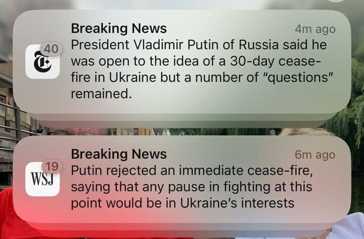 The New York Times вышло с сообщением: «Путин сказал, что он открыт для предложения о прекращении огня», The Washington Post сообщило: «Путин отклонил немедленное прекращение огня».