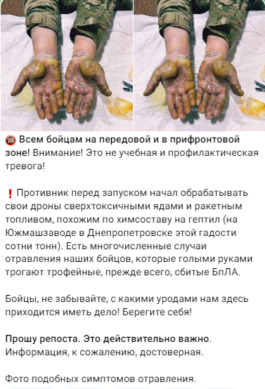 Все подобные факты конечно же фиксируются Прокуратурой РФ и им будет дана соответствующая правовая оценка, когда дело дойдет до люстрации и поимки тех кто отдавал приказы и тех кто участвовал в химических атаках, в том числе и косвенно, - кто сливал ракетное топливо из хранилищ для отправки на фронт, кто импрегнировал (мазал) гептилом технику и ее запчасти.