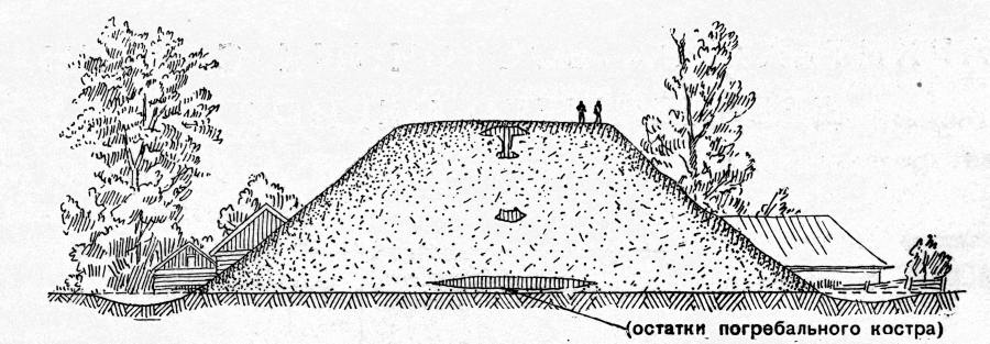 На рис.9.5 показан разрез кургана "Черная Могила" в Чернигове. Солидный масштаб сооружения хорошо виден по фигуркам людей на вершине кургана.