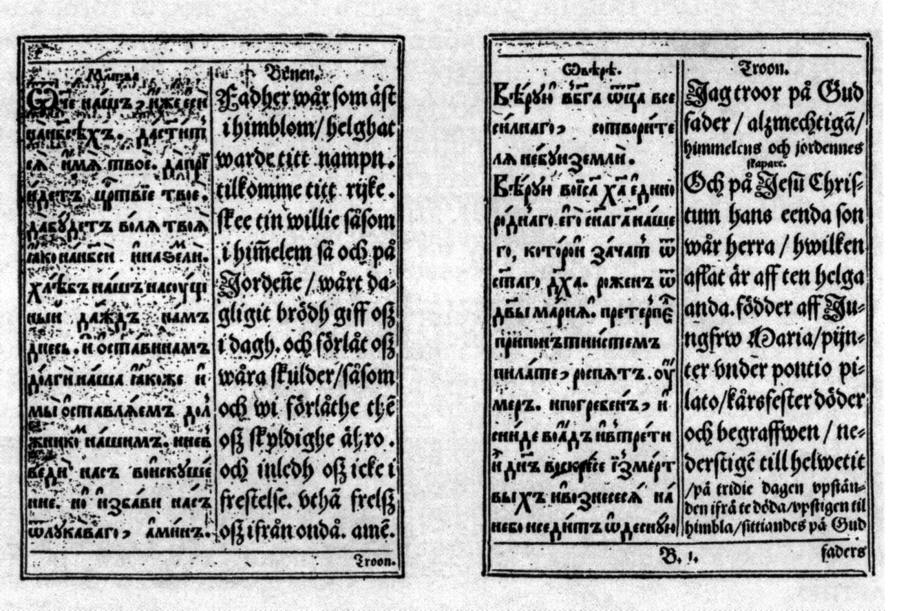 <<Густав Адольф в 1618 г. пригласил голландского литейщика и печатника Петера ван Зелова, который должен был создать (или восстановить после погрома Реформации? - Авт.) в Стокгольме КИРИЛЛИЧЕСКИЕ шрифты... В типографии ван Зелова вышел Alphabetum Rutenorum ("Российский алфавит", 1638 [?]) - азбука, в которой кириллический алфавит был представлен вместе со шведскими произносительными эквивалентами (рис.9.11 - Авт.). Кроме того, в эту книгу вошли Отче наш, Символ веры и Десять заповедей Господних - параллельный текст на церковно-славянском языке в левом столбце и на шведском - в правом...