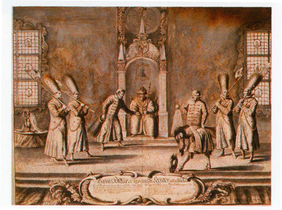 Рис.9.14. Рисунок из труда Эрика Палмквиста "Наблюдения о России", 1674 год. Показан прием шведского посла русским царем Алексеем Михайловичем. Государственный архив. Швеция. Палмквист был в составе шведского посольства 1674 года, направленного в Москву. Во время посольства он создал этот труд, снабдив его собственноручными чертежами, картами и рисунками. Взято из [618:0], с.141.