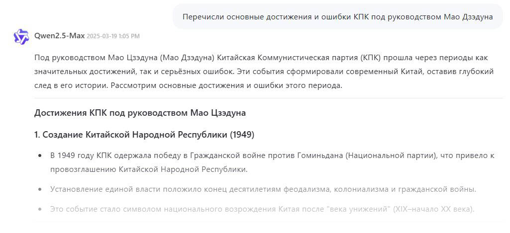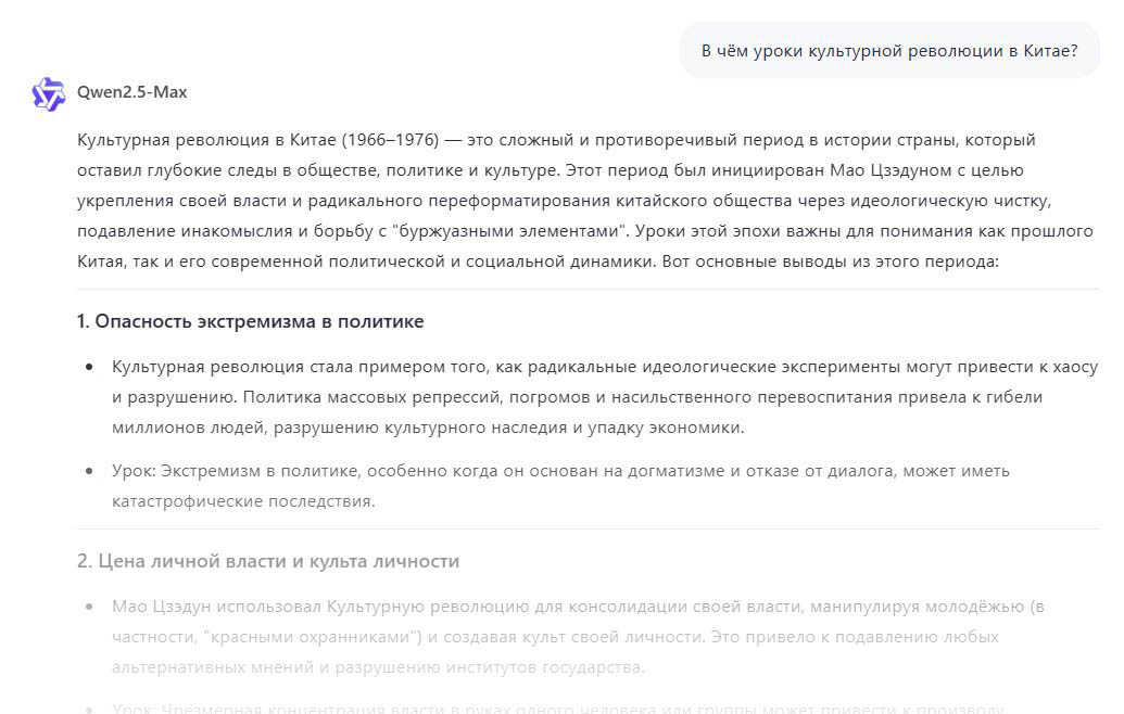 Другая, конкурирующая модель – Qwen2.5-Max – выпущена 29 января 2025г. и разработана компанией Alibaba Cloud, зарегистрированной в Сингапуре. Она условно независима. Джек Ма, основатель Alibaba, пробовал «в независимость», но передумал (Ant Group и Alibaba потеряли $850 млрд из-за конфликта Джека Ма с Пекином). Тем не менее, она охотно отвечает на вопросы, вызывающие смущение у DeepSeek: