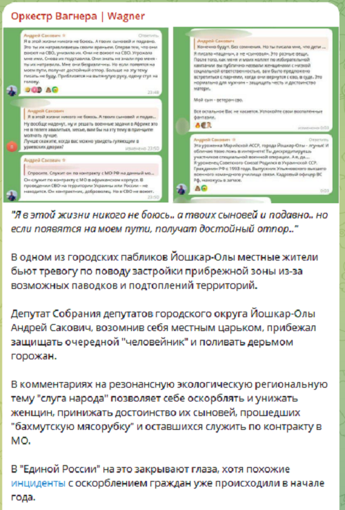 Депутат горсовета Йошкар-Олы Андрей Сакович давно ходил по тонкому льду, позволяя себе хамить и оскорблять в соцсетях чуть ли не каждого встречного-поперечного. И вот, судя по всему, лёд под ним начал трескаться, потому что на него обратили внимание бойцы из ЧВК «Вагнера», а это уже вам не в комментариях ругаться.