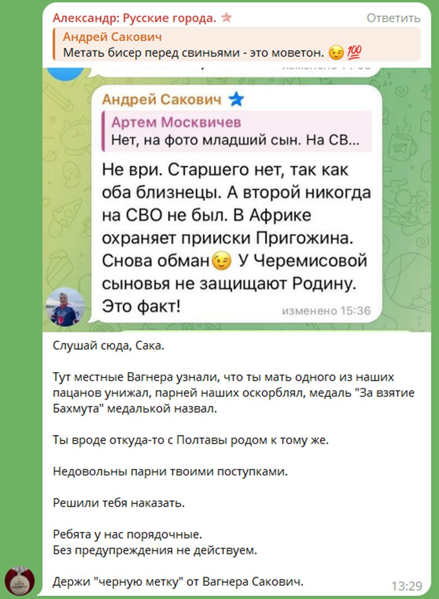 Поводом для внимания стали нападки депутата на женщину, сын которой служит в Африканском корпусе. Сакович в выражениях не стеснялся, что и вызвало гнев «вагнеровцев». Сначала его пытались урезонить в частном порядке в комментариях – не помогло. Ну а потом уже вынесли на суд широкой общественности, может хоть так в «Единой России» обратят внимание на гниль в своих рядах.