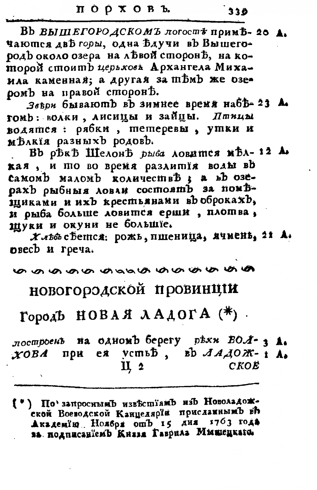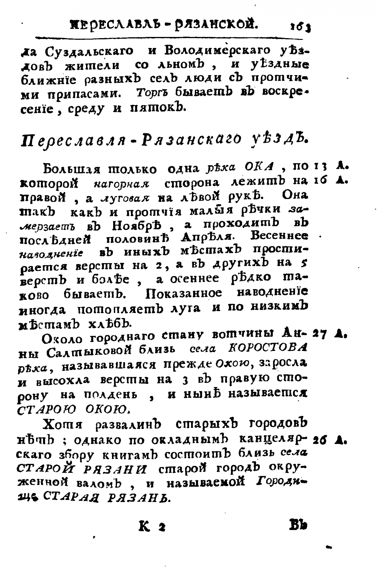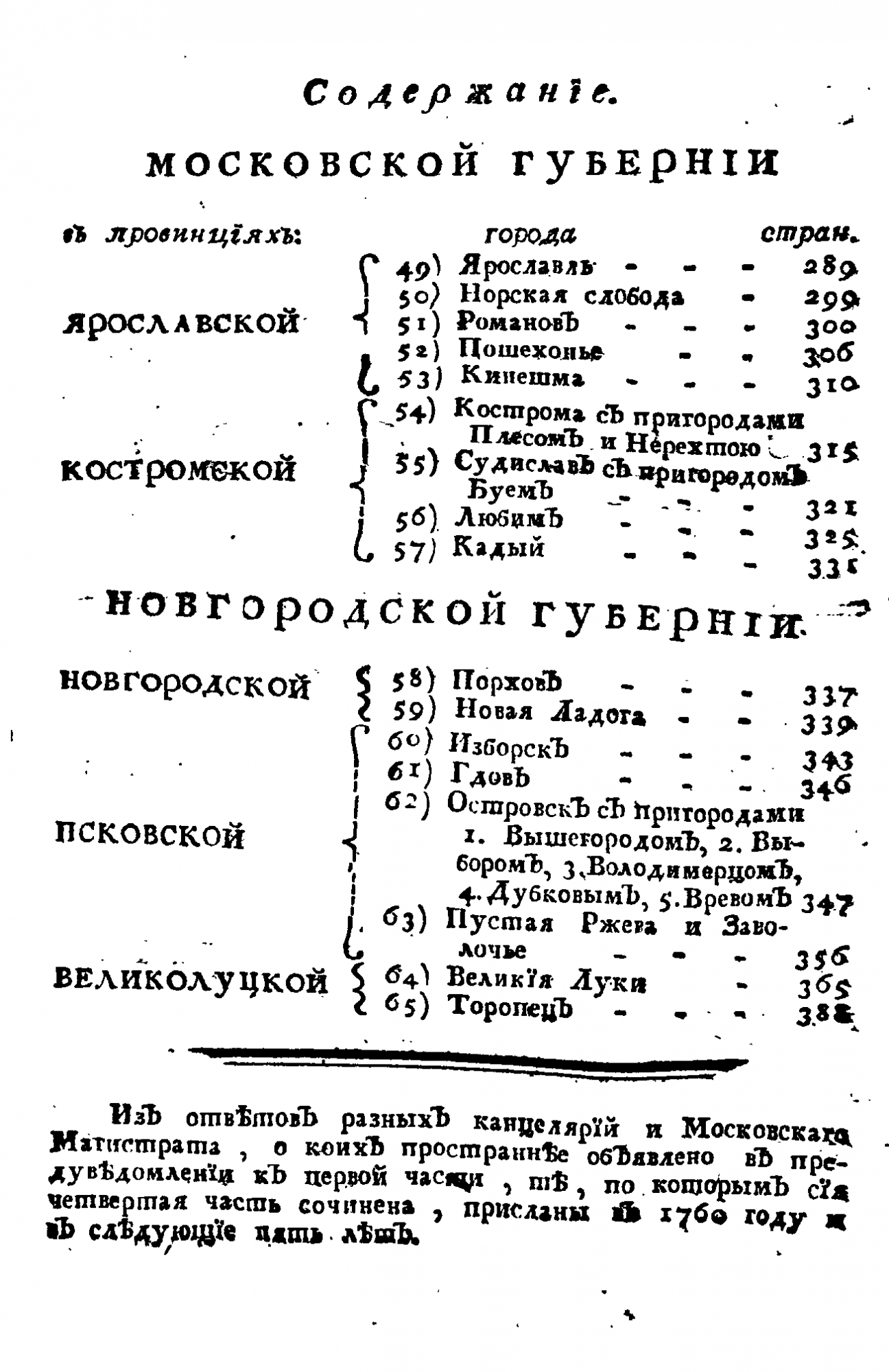 Когда рек, сел, деревень, слобод и прочих собственныея имена напечатаны большими буквами, как например на первой странице "МОСКВЕ, НЕГЛИННОЙ и ЯУЗЕ - КИТАЙ ГОРОДЕ - БЕЛОМ ГОРОДЕ": то сие знаком, что помянутые реки, села и проч. находятся без сумнения в том самом городе или уезде, в описании котораго те встречаются. Когда те же имена повторяются дважды или чаще в том же городе или уезде, то они без особливой причины большими буквами паки уже не печатались. Есть и такие случаи, которые требовали, чтобы тех имен и в первый раз большими литерами не писать.