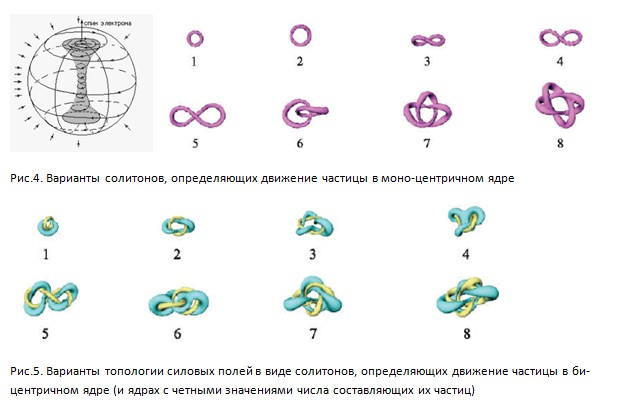 Для уточнения картины необходимо добавить, что каждому типу взаимодействия, а значит – каждой субчастице (или правильнее - каждой паре субчастиц: G - G; γ-˜γ; νe -˜νe;νμ -˜νμ ) соответствует свой солитон, свое поле, по закрученным силовым линиям которого и осуществляют движение сами частицы. Солитоны же (или поля основных видов взаимодействий), вероятно, имеют разные размеры и располагаются внутри друг друга как в матрешке.