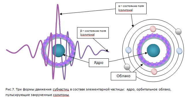 Таким образом, в Модели элементарной частицы Автором рассматриваются три ключевых формы движения субчастиц: ядро, пульсирующие солитоны, облако.