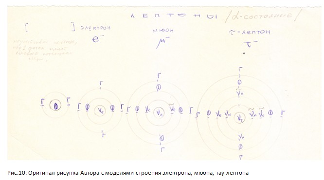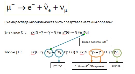 «При распаде мюона «избыточные фотоны … распределяются хаотично между образующимися частицами, не нарушая их структуры (некоторая часть фотонов может сразу излучаться в виде гамма-квантов). В дальнейшем избыточные (над основным состоянием частицы) фотоны излучаются в виде реальных квантов».
