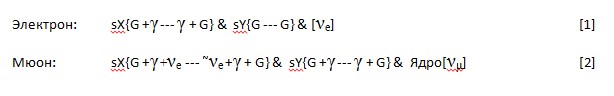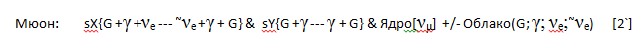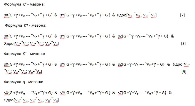 Напомню, что формула состава субчастиц для тау-мезонов (см. формулу [3]) содержит компоненту: +/- Облако(G; γ;˜γ; νe;˜νe;νμ;˜νμ). Соответственно, для пи-мезонов и каонов в формулах [4]-[9] по умолчанию должна присутствовать аналогичная компонента: +/- Облако(G; γ;˜ γ; νe;˜νe).