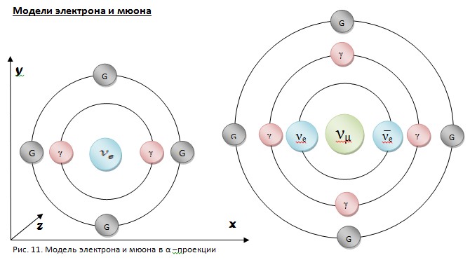 Модель предполагает, что частицы, считающиеся фундаментальными в Стандартной Модели (СМ) – лептоны (электрон, мюон, тау-лептон, нейтрино) – являются составными. Например, электрон (формула [1]) состоит из гравитонов (G), фотонов (γ) и электронного нейтрино (Ve). Мюон ([2]) еще сложнее, включая мюонное нейтрино (Vμ) и т.д.