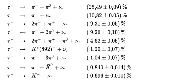 Известные каналы распадов тау-лептона на адроны (https://ru.wikipedia.org/wiki/%D0%A2%D0%B0%D1%83-%D0%BB%D0%B5%D0%BF%D1%8...) :