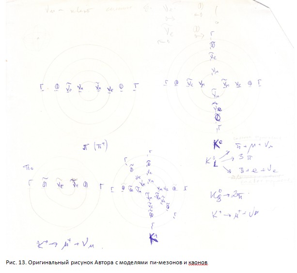 Возможно, для тех, кто попытается развить теорию Автора будет полезно расшифровать такие его примечания на листе с моделями К-мезонов: