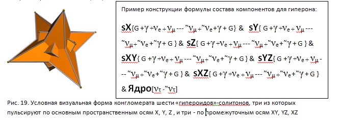 Можно предположить, что пространственная форма строения гиперонов будет напоминать конгломерат не трех (как ранее), а шести «гипероидов»-солитонов: пульсирующих вокруг ядра не только по осям X, Y и Z, но и по промежуточным осям X-Y, Y-Z, X-Z: