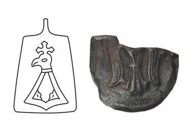 Об этом предмете Алексей Юрьевич пишет следующее: «Неизвестно, имеем ли мы дело то ли с накладкой на упряжь коня, или с опокой для тамги мечника». Через пару абзацев находка внезапно превращается в форму для княжеской печати, на которой изображен якобы герб Рюриковичей, причем на этом строится вся остальная аргументация. Почему княжеские печати отливали в Ладоге, если князья тогда сидели в Киеве? Почему это именно герб, если герб у Рюриковичей совсем другой и хорошо известен? Наконец – находка отнесена автором к 950 году, т.е., времени правления Святослава. До нас дошла его гербовая печать, там двузубец и ничего похожего на эту форму. Ответы на данные вопросы не раскрыты в работе, но ниже автором приводится герб то ли Владимира, то ли Ярополка на серебряной тамге из Пскова.