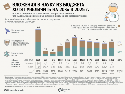 Три года подряд вложения в науку падали и к 2024 г. снизились до минимального за 18 лет значения