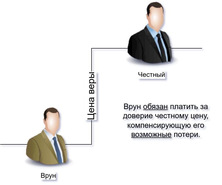 Если всё ранее было выполнено по честному, то в последующем высота этой ступени доверия равна нулю, а это значит, что ни одна сторона не понесёт дополнительных издержек из-за дополнительных работ по приведению веры в соответствие. То есть взаимная честность выгодна, звучит банально тупо, но это именно так. Нет нужды в лишних телодвижениях, каждый выполняет свою часть работ не расходуя силы на противодействие и его преодоление.