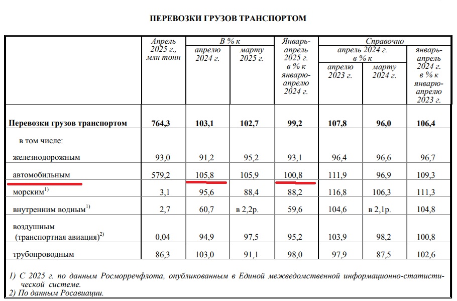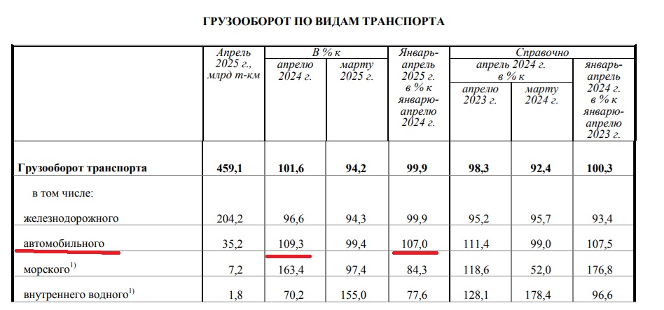 Как видите, рост объёмов автомобильных грузоперевозок не просто есть/продолжается. Он и по абсолютным объёмам и по динамике таков, что практически компенсирует проседание объёмов на ЖД, "выводя в ноль" (без десятых долей процента) общестрановой показатель (по всем видам транспорта). Причем надо понимать, что эти проценты - относительно 2024 года, который был лучшим в истории РФ по объему автогрузоперевозок.