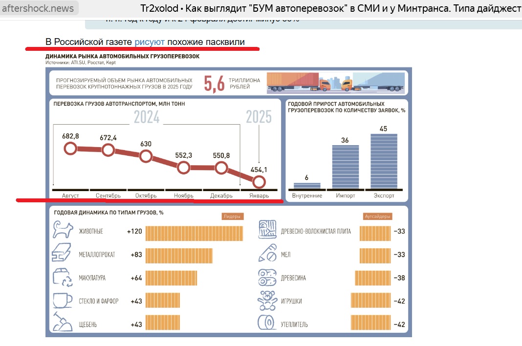 В 3-й части на 20+ строках цитируется сообщения ТАСС о действиях Минтранса, которые (строки) цифр статистики объёма грузоперевозок вообще не содержат. Там обсуждается проблема роста издержек перевозчиков и лизинговых платежей и то как Минтранс думает помогать. Каким боком Холод расценил это как "опровержение" роста объема автоперевозок- Бог весть. То есть "Холод" здесь притащил и вовсе какой-то "оффтоп" для количества. Спешил. Не до вычитывания было. Понять и простить (нет).