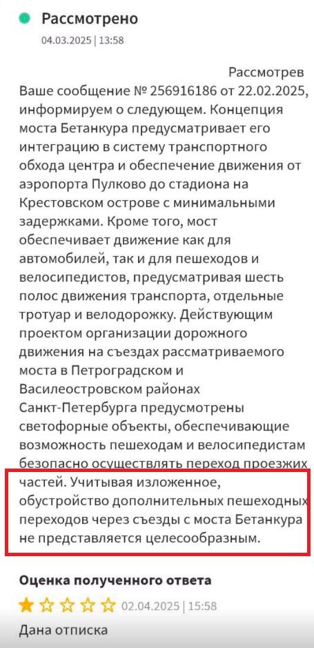 Ниже привожу пример жалобы на развязку моста Бетанкура где жалуюсь на необходимость сделать крюк в 300 метров, просто чтобы перейди улицу и зайти на мост.