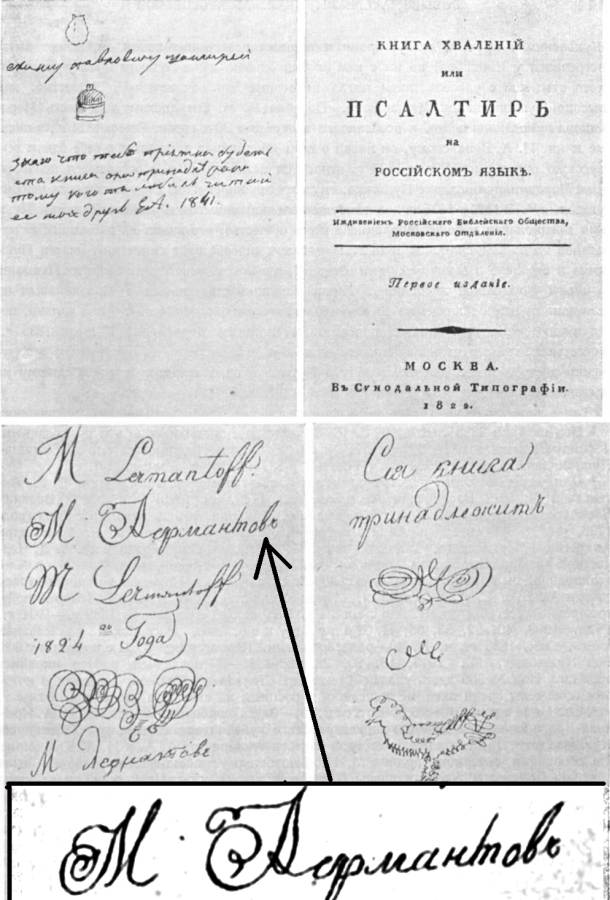 Рис.165. Автографы М.Ю.Лермонтова - тогда еще ЛЕРМАНТОВА - на одной из его книг в 1824 году. В 1841 году эта книга была подарена Е.А.Арсеньевой Акиму Павловичу Шан-Гирей, о чем гласит дарственная надпись слева вверху. Взято из статьи Л.Модзалевского "Письма Е.А.Арсеньевой к П.А.Крюковой" (lermontov-lit.ru)