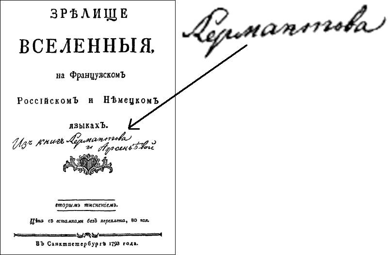 Рис.166. Автограф "Изъ книгъ Лермантова и Арсеньевой" в одной из книг из библиотеки М.Ю.Лермонтова. Взято из статьи "Личная библиотека М.Ю.Лермонтова" (lermontov-lit.ru)