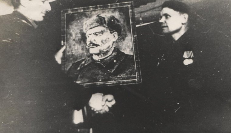 Сын Собянина Семён Гавриилович (справа) с портретом отца/Фото: Фонд Музея природы и человека, Ханты-Мансийск
