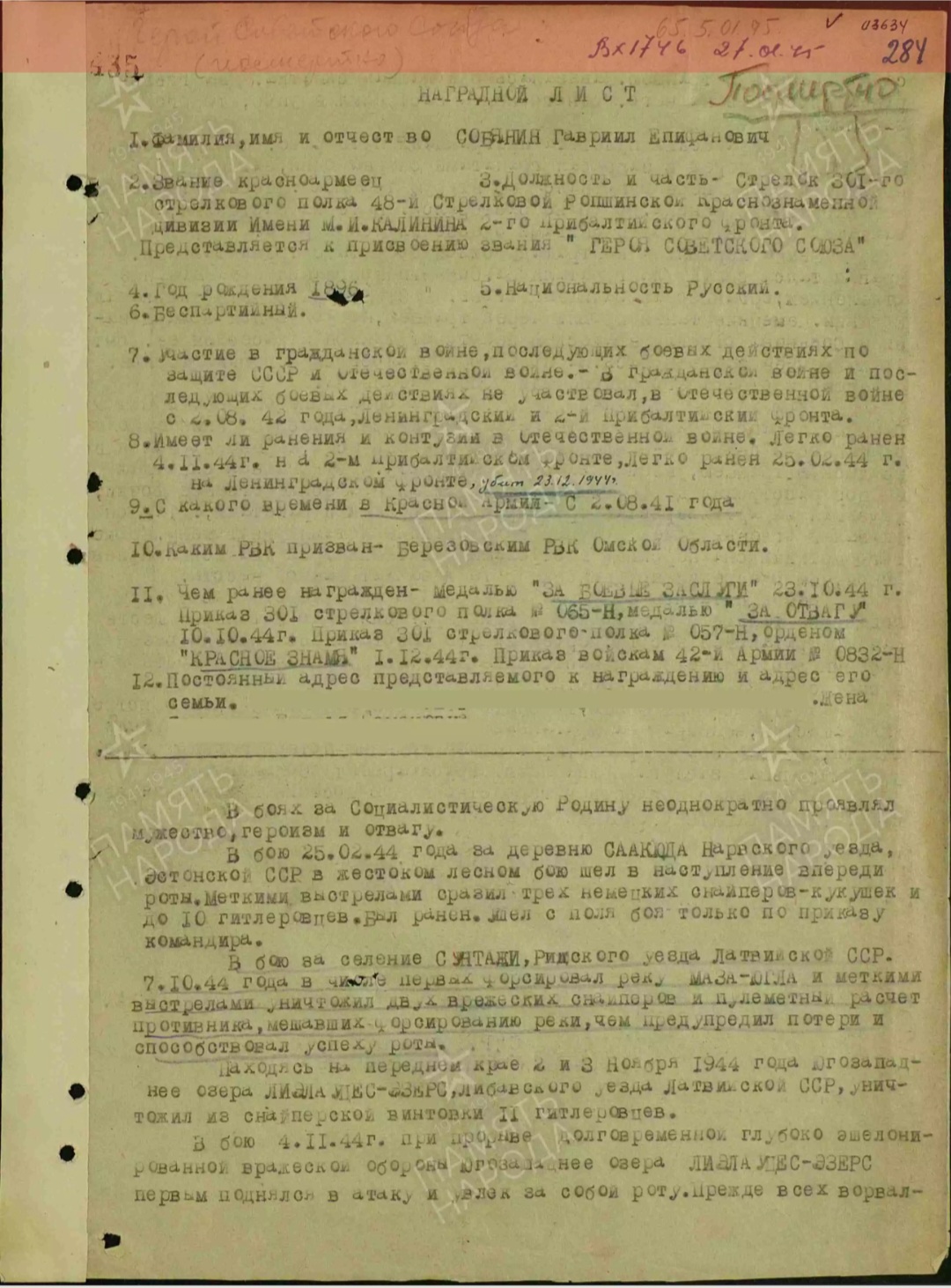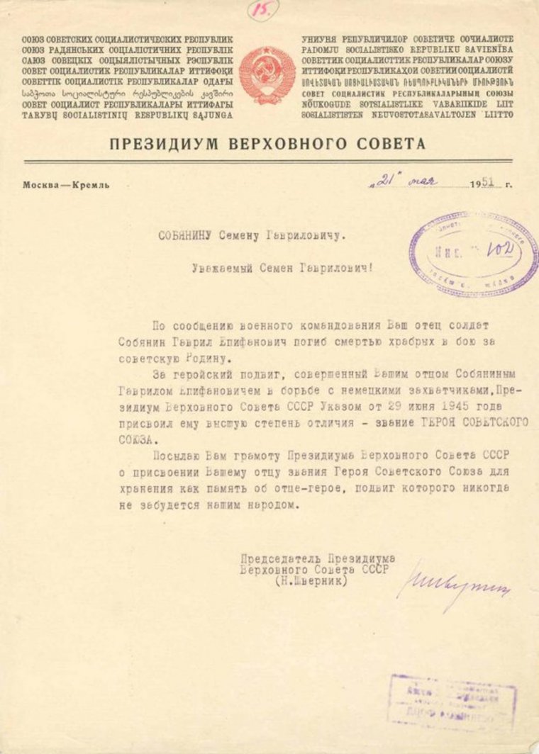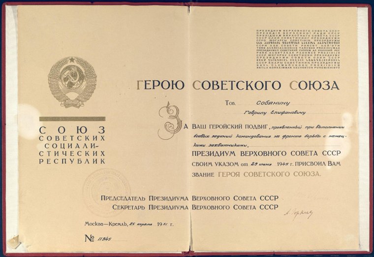 Приказом Министра Обороны СССР № 255 от 31 декабря 1945 года Гавриил Епифанович Собянин зачислен навечно в списки 1-й роты 333-го мотострелкового полка.