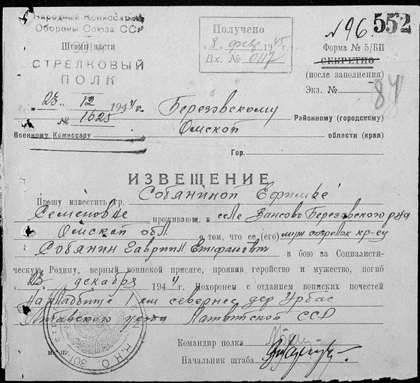 Извещение о гибели Собянина Гавриила Епифановича. 23.12.1944 г./КУ «Государственный архив Югры». Ф. 634. Оп. 1-л. Д. 38. Л. 552.
