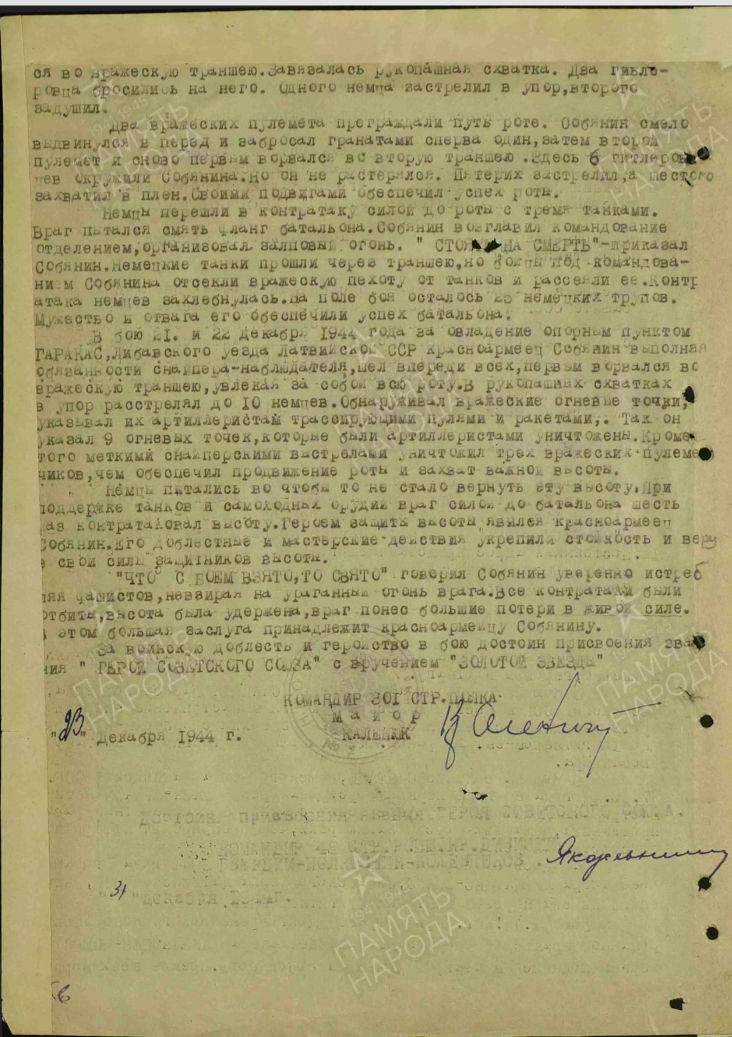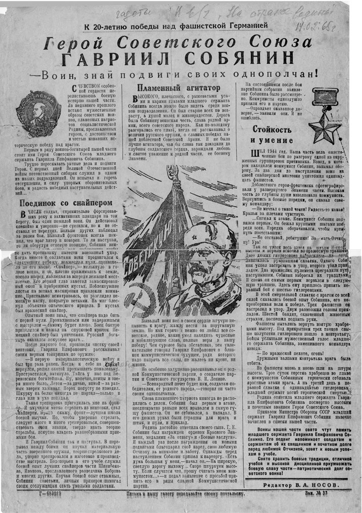 Статья о подвиге Собянина Г.Е. (газета «На страже Родины»)/ Березовский районный архив. Фонд 66. Опись 3. Ед. Хр. 2. Лист 1.