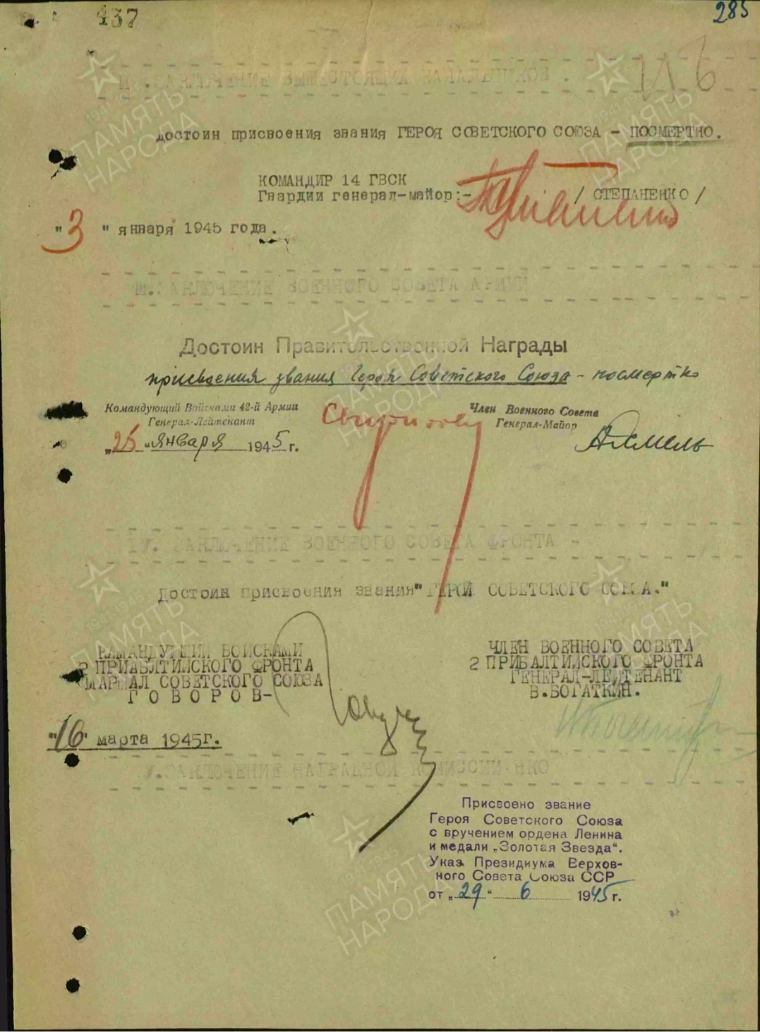 В июне ему было присвоено звание «Герой Советского Союза» с вручением ордена Ленина и медали «Золотая Звезда» посмертно.