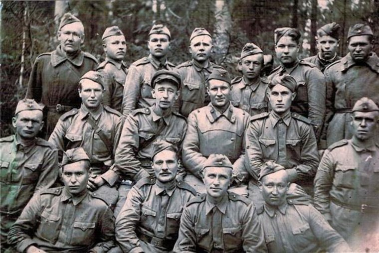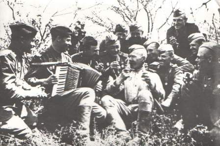 Гавриил Епифанович Собянин в центре с самокруткой в руке в кругу боевых товарищей. 1944 г.