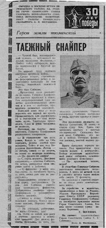 …Стоят бюсты героя Советского Союза Гавриила Епифановича Собянина в Ханты-Мансийске, Березове и Игриме, ходят люди по улицам, названным его именем. Но, наверное, все же не это главное. Имя Героя помнят, перед ним преклоняются. Его подвиг остался в сердцах людей и… продолжается династия Собяниных – тружеников и воинов – защитников Отечества…